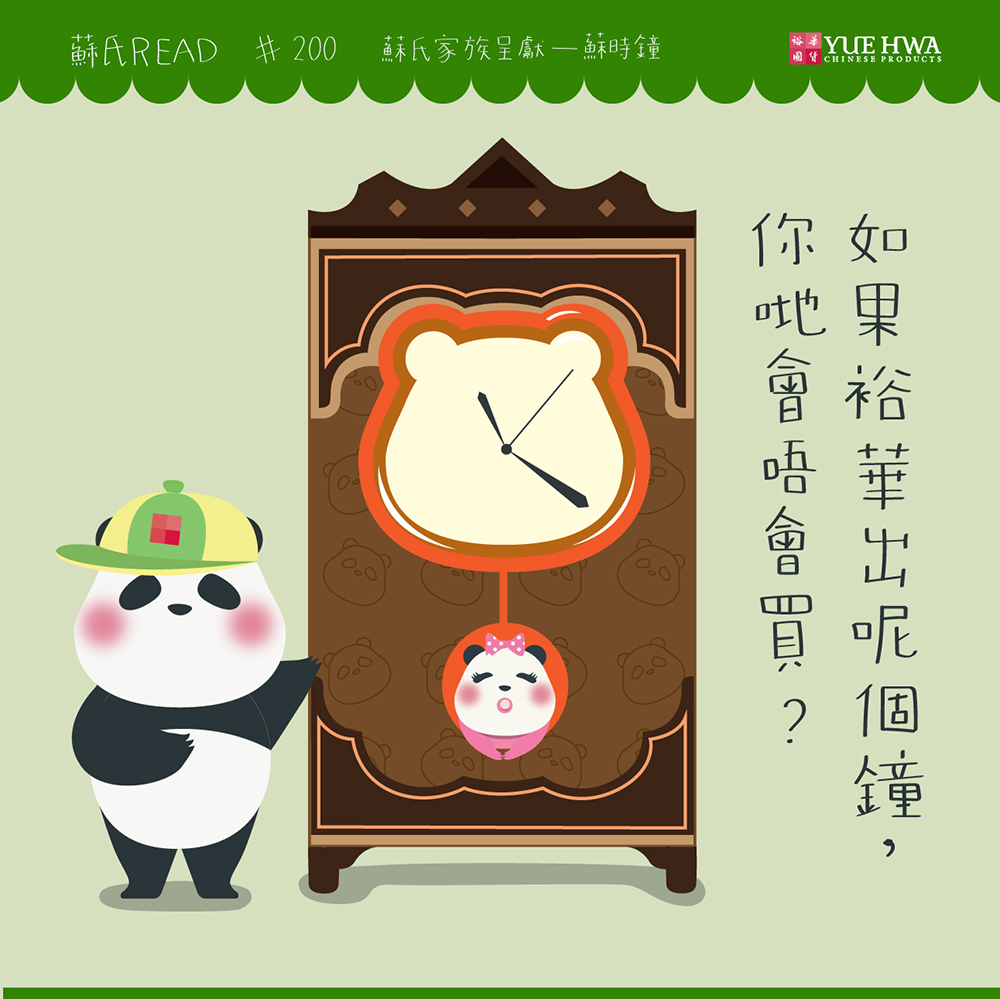 【蘇氏家族誠意呈獻–蘇時鐘】 唔知裕華賣蘇時鐘大家會唔會買呢?各位如果對鐘錶有興趣,記住Mark實嚟6月19日至 7月19日 喺裕華國貨佐敦總店舉行嘅《精工時鐘展~暨時尚生活傢俬及家品展》啦!除咗有好多同蘇時鐘一樣咁靚嘅精工時鐘,仲可以一次過欣賞埋唔同時尚生活傢俬同家品,到時記住嚟參觀吓啦! 講開鐘錶同時間,原來不經不覺間「蘇氏Read」已經嚟到第200期啦,如果大家都鐘意蘇氏家族,記得比個Like佢哋啦!咁佢哋就會更有動力,喺未來嘅日子繼續帶歡樂比大家啦!