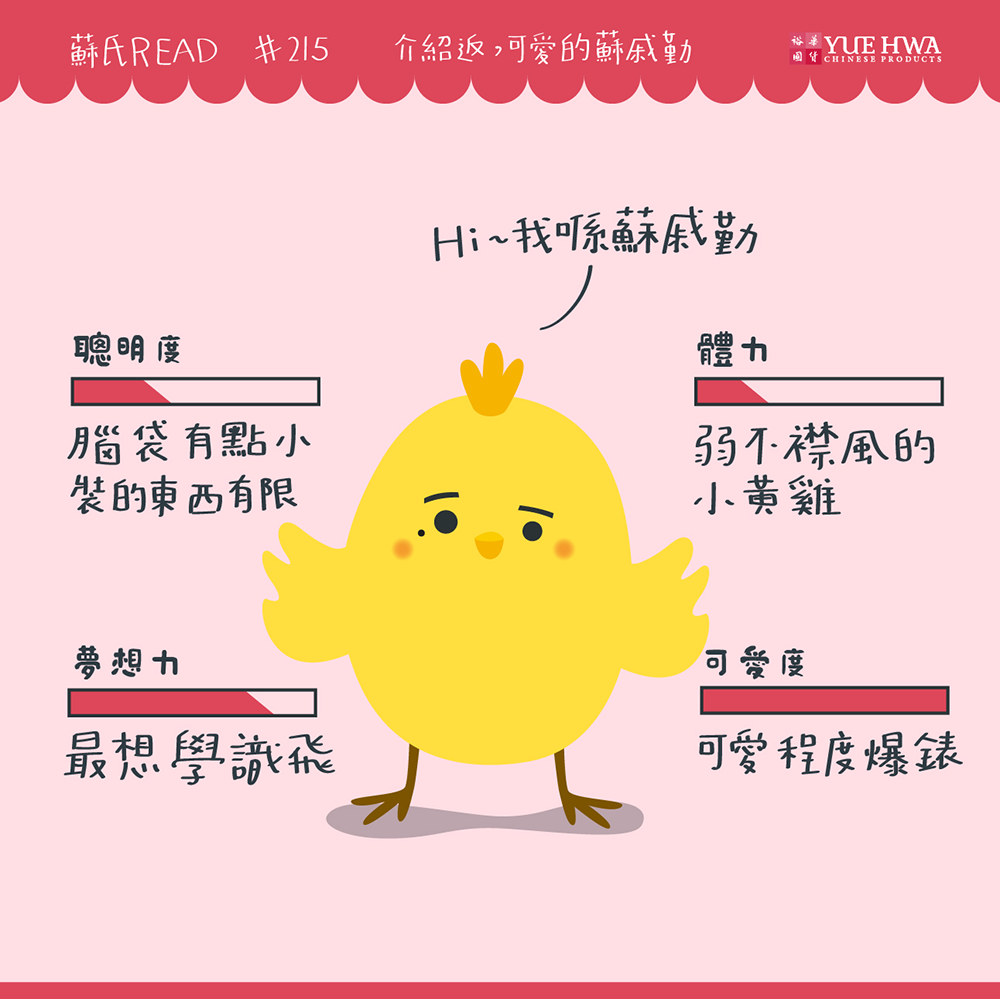 【介紹返,可愛的蘇戚勤】 佢係蘇家嘅寵物,黃色皮膚圓蛋身形人見人愛,取名戚勤(Chicken)因為佢係一隻雞仔(但佢自己唔知道)。 戚勤以為自己係隻雀仔,自細已經好想學飛,而蘇家上下亦無特別話返比佢知道真相,因為一來唔想傷害佢弱小嘅雞心靈,二來係因為佢地好欣賞蘇戚勤咁細個已經咁有夢想,話唔定將來,佢真係會變成一隻可以喺天空振翅翱翔嘅雞呢!
