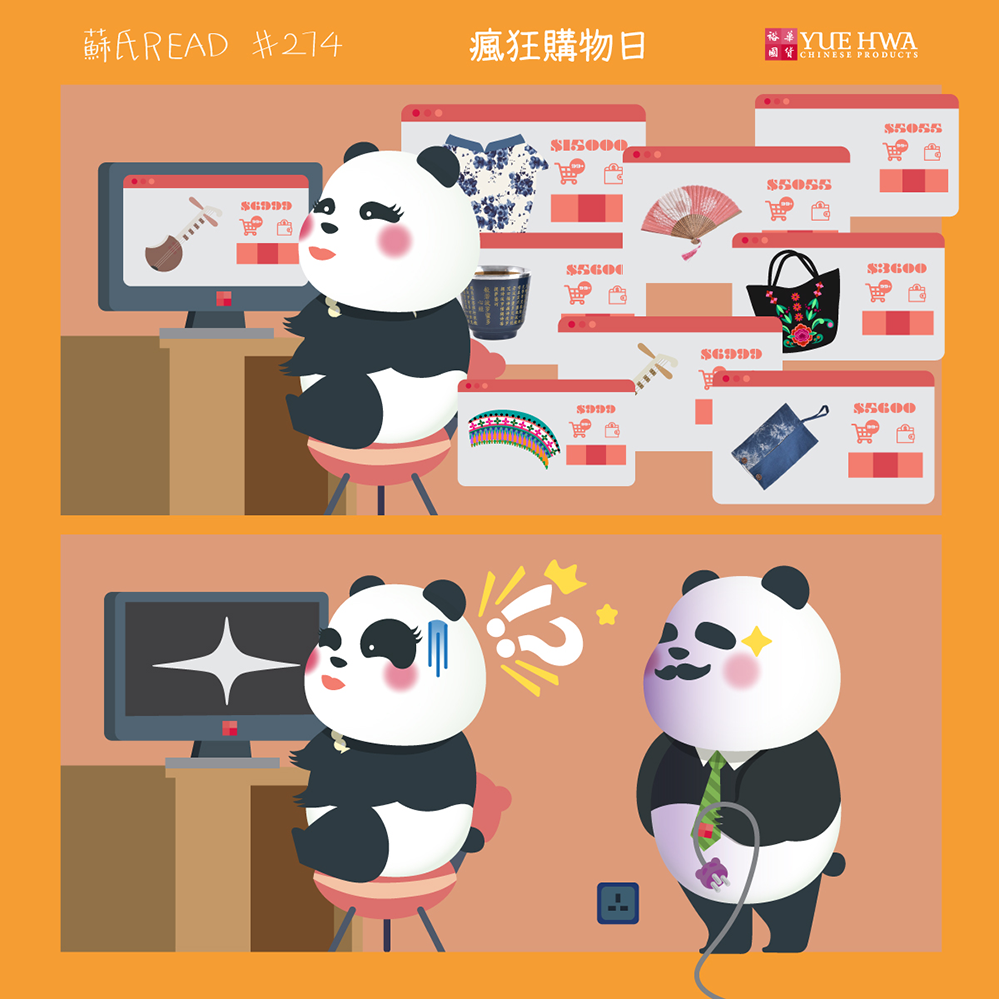 【瘋狂購物日】 雙11係近年興起嘅一個瘋狂購物大節日,無論係實體店定係網上購物,都造成咗一股購物狂潮。 蘇嫂當然都唔會執輸啦,坐喺電腦面前起勢咁買,買到架購物車都滿曬。 蘇波榮見到呢個情況,面都青晒,因為蘇嫂係用緊佢張信用卡去買。 蘇波榮情急智生,用咗一招化解呢個危機!!! 有無勇士老公都夠膽咁做?!
