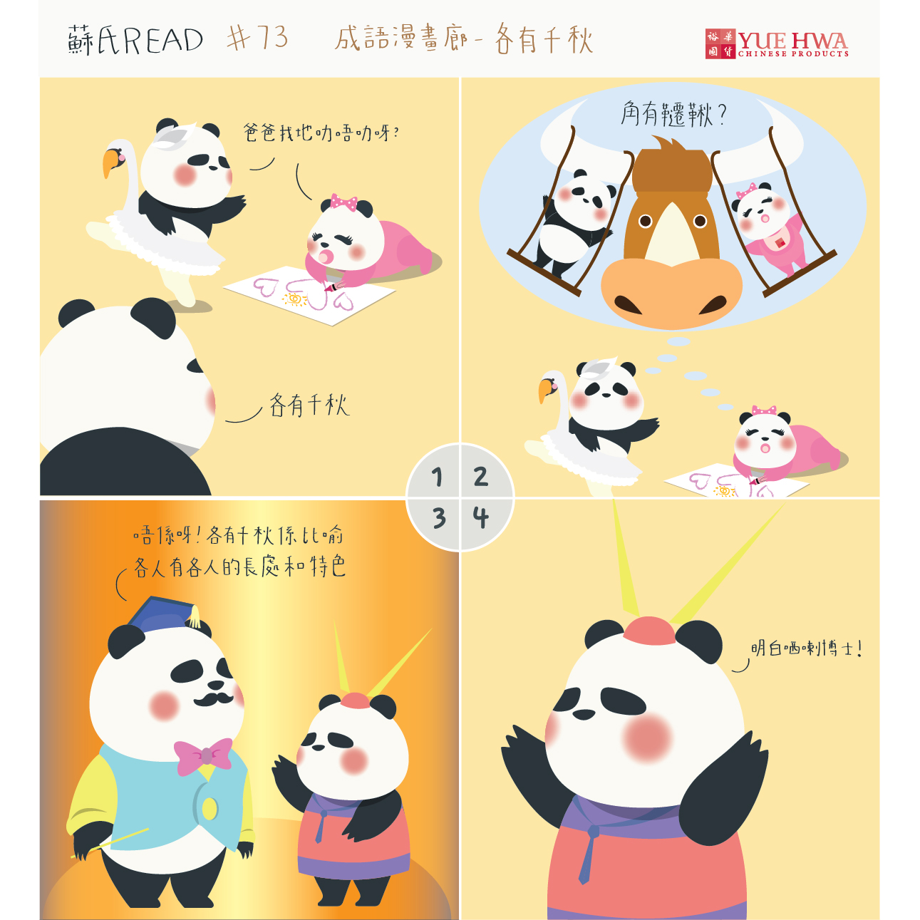 【成語漫畫廊 - 各有千秋】熊貓博士又返嚟喇!呀唔係,係波榮先啱~見到Jack蘇舞藝咁精湛,蘇蝦咁細個已經畫功了得,相信作為爸爸嘅波榮一定好欣慰喇。但兩個細路嘅中文似乎要惡補下先得喇……
